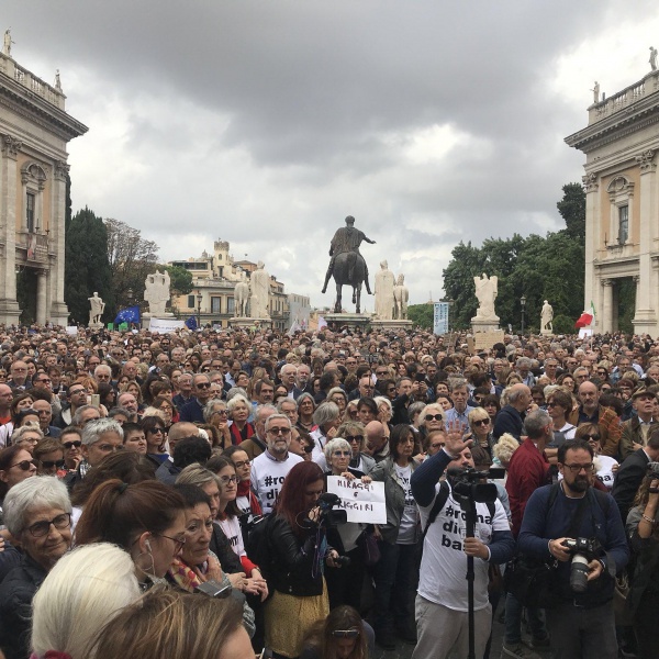 "Roma dice basta". In una piazza del Campidoglio gremita si sono riuniti oggi centinaia di romani per la "Dignità di Roma" e per protestare contro la "grande monnezza", le buche e "l'abbandono della città". Una manifestazione pacifica con tanti cartelli ironici: da "Raggi, una buca vi inghiottirà" a "Roma (pulita) o morte". "Vogliamo che Roma torni a essere una Capitale: inclusiva, vivibile, accogliente, con un'idea di futuro". È l'appello del comitato promotore del sit-in, #Romadicebasta che si sta svolgendo in Campidoglio. L'iniziativa è nata da un appello su Facebook partito dal gruppo "Tutti per Roma. Roma per tutti" che - come spiega una delle promotrici, Martina Cardelli - conta 22mila iscritti. Si tratta di un gruppo civico "formato da sei donne romane, ognuna con il suo lavoro e con la propria famiglia" che promuove "l'idea della partecipazione civica come elemento di pressione nei confronti delle istituzioni per migliorare la città".